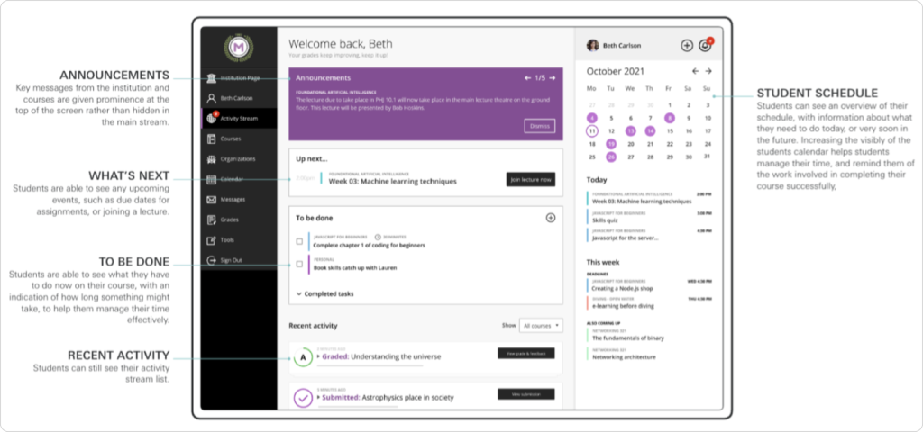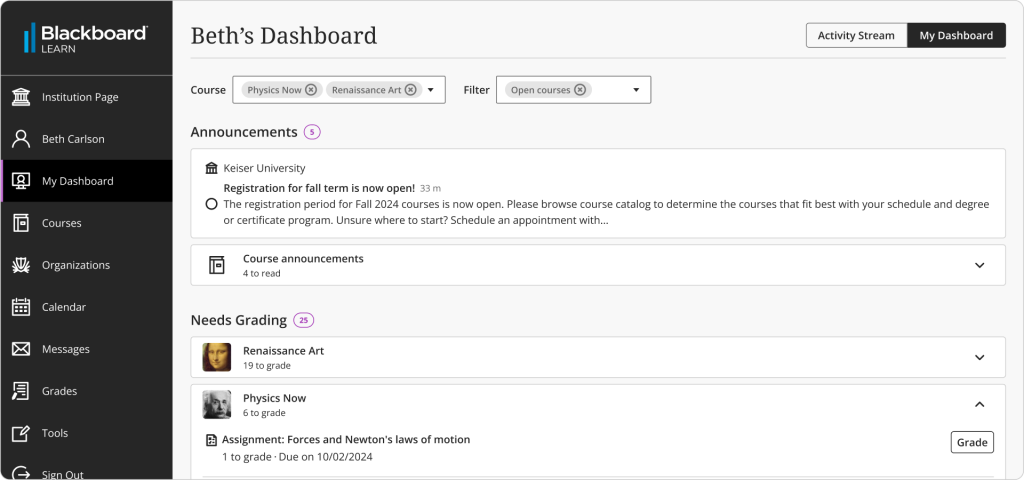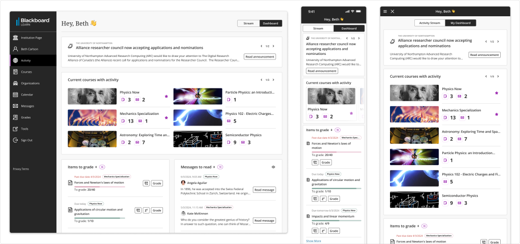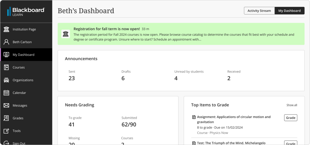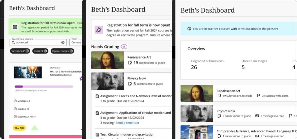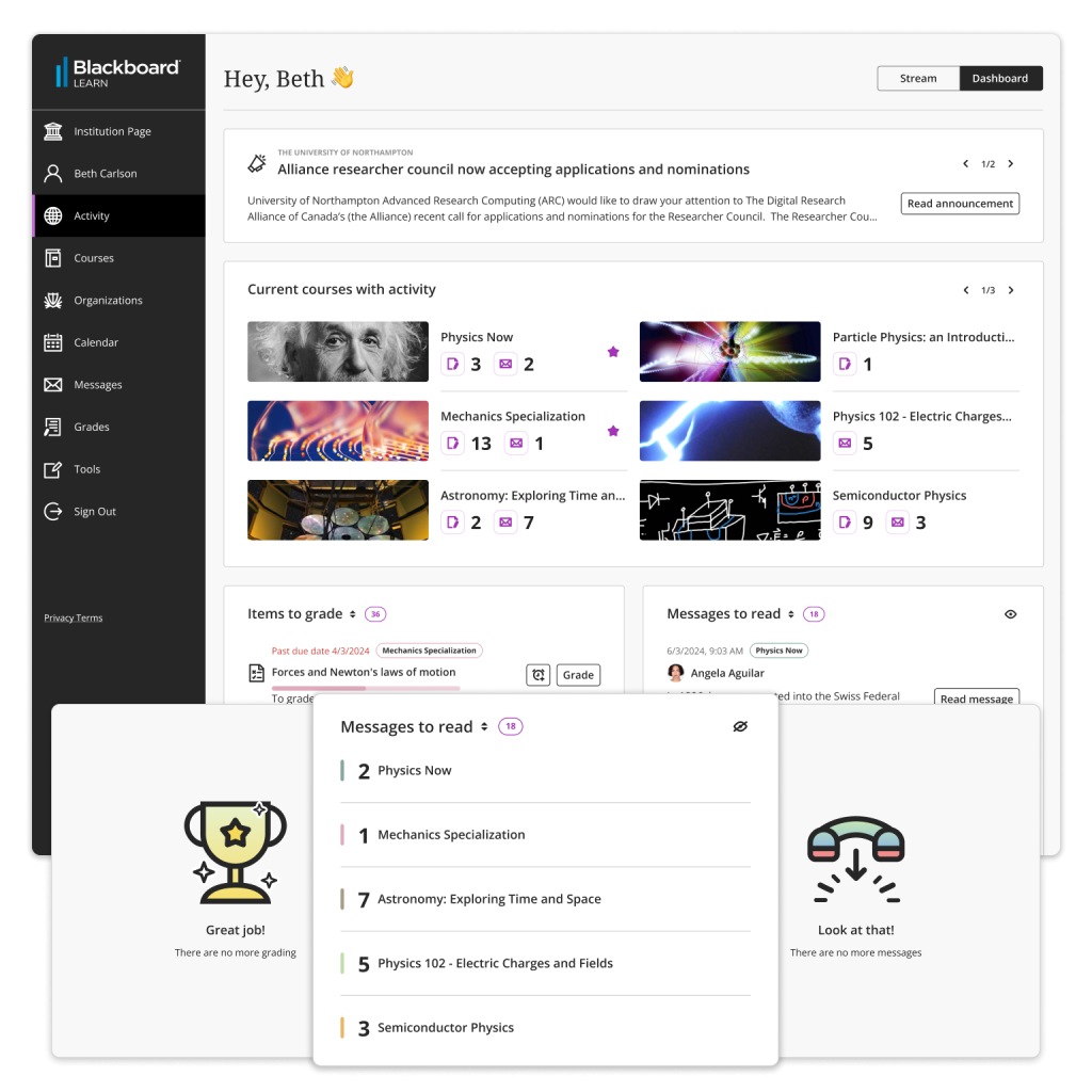 - General Course Activity: Key pain points for instructors include accurately identifying items that need grading and having better visibility into unread messages.